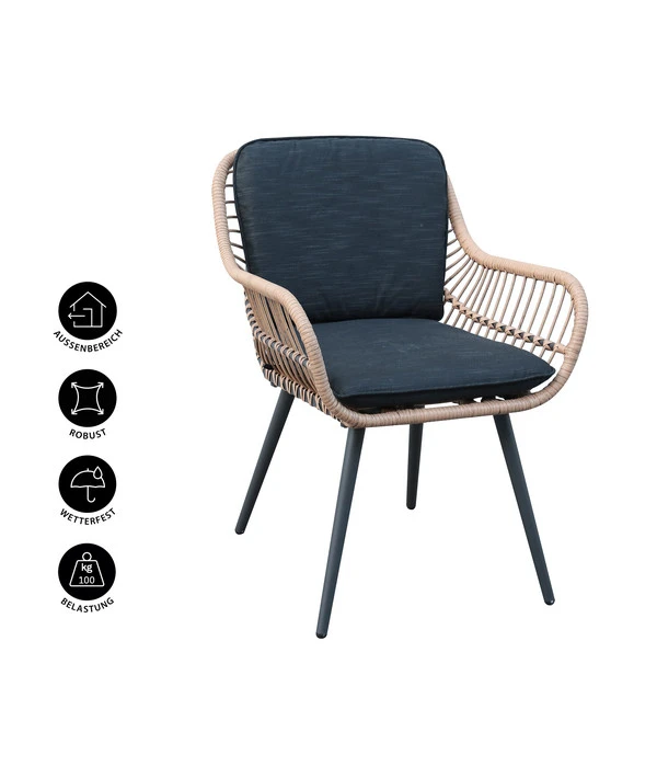 Der Gartenstuhl Venezia von Dehner wird mit einem angenehmen Sitzkissen geliefert und ist nicht nur gemütlich, sondern auch eine optische Bereicherung für Ihren Außenbereich. Mit dem modischen Flechtlook und den schmalen Metallbeinen erhält das Outdoor-Möbel ein attraktives Äußeres im angesagten Boho-Stil. Egal, ob auf dem Balkon, der Terrasse oder im Garten – mit dem Gartenstuhl Venezia von Dehner beweisen Sie Geschmack. Zudem überzeugt der Gartenstuhl Venezia auch durch die bewährte Dehner Markenqualität. Der robuste Sessel aus Aluminium hält dank hochwertiger Materialien und Pulverbeschichtung problemlos jeder Witterung stand. Entscheiden Sie sich jetzt für den Gartenstuhl Venezia und freuen Sie sich auf entspannte Stunden in Ihrem Zuhause!