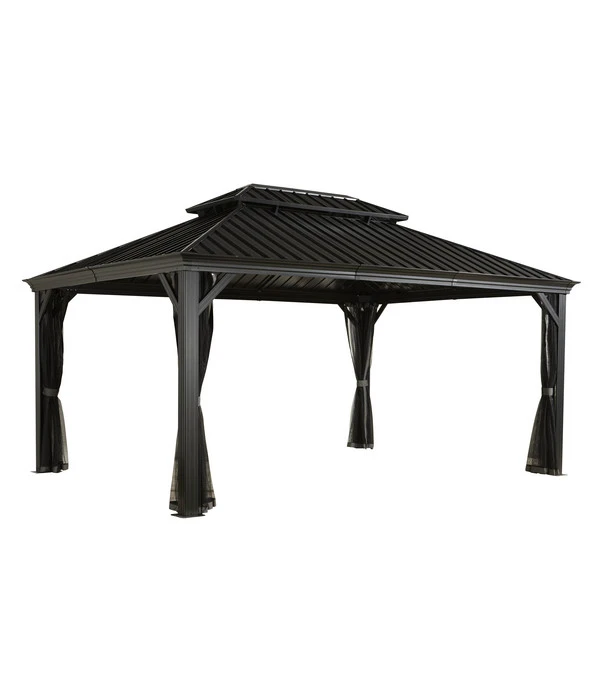Anders als viele andere Pavillons besteht das Dach beim Sojag Pavillon Messina nicht aus Kunststoff oder einem Textilmaterial, sondern aus solidem, absolut formstabilem Stahl. Dank der galvanischen Beschichtung hält das Dach sämtlichen Witterungen wie Sonne, Regen oder Schnee ohne Probleme Stand. Ja, es hat sogar eine außergewöhnliche Schneelast von 125 kg/m². Nicht nur alle Aluminiumteile sind absolut rostfest, sondern auch die Schrauben bestehen aus rostfreiem Edelstahl, sodass Sie Ihren Sojag Pavillon Messina über den Winter nicht abbauen, sondern unbesorgt im Freien stehen lassen können. Und wenn die Sommer immer heißer werden sollten, werden Sie es besonders schätzen, dass das doppelte Dach besser belüftet und so ein Hitzestau vermieden wird. Außerdem sind Regenrinnen für einen geregelten Abfluss von Regenwasser integriert.
